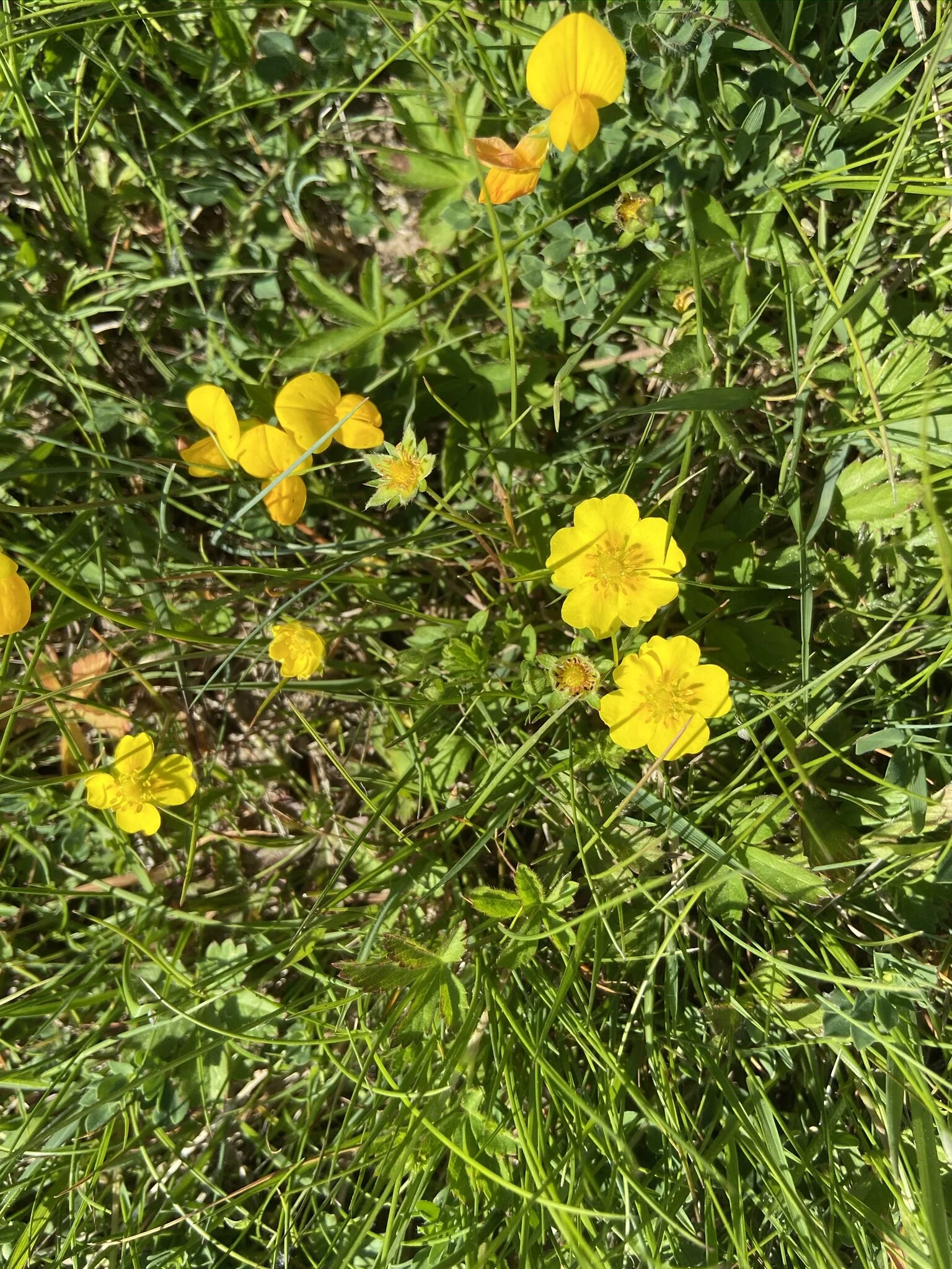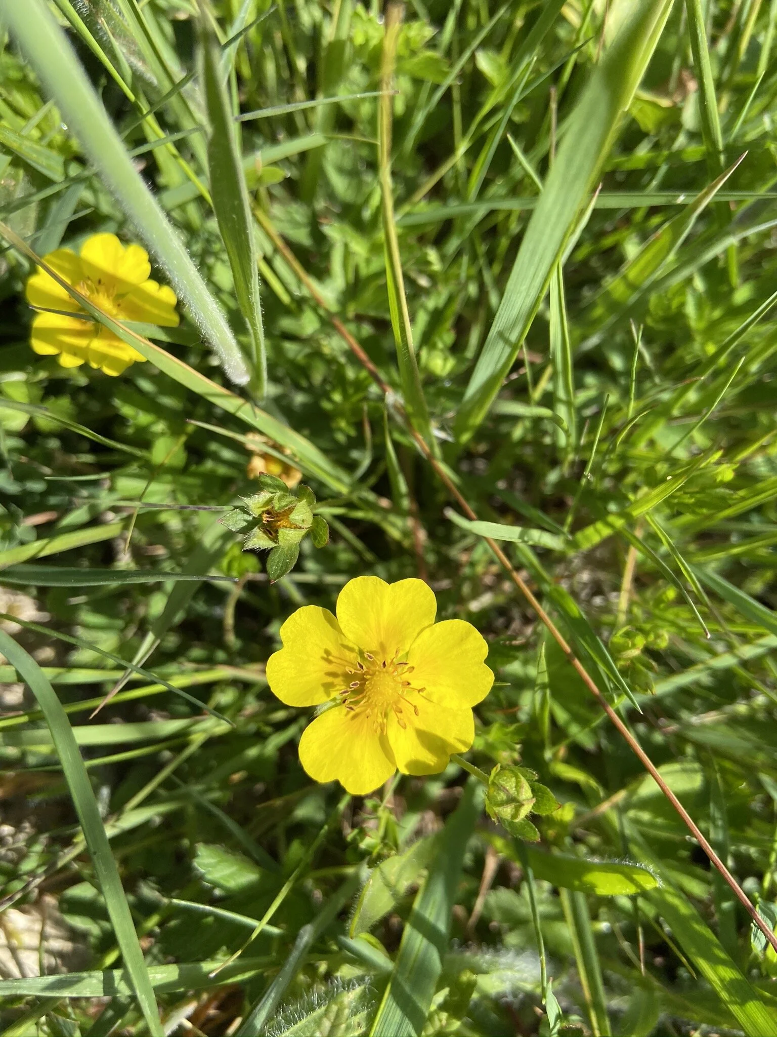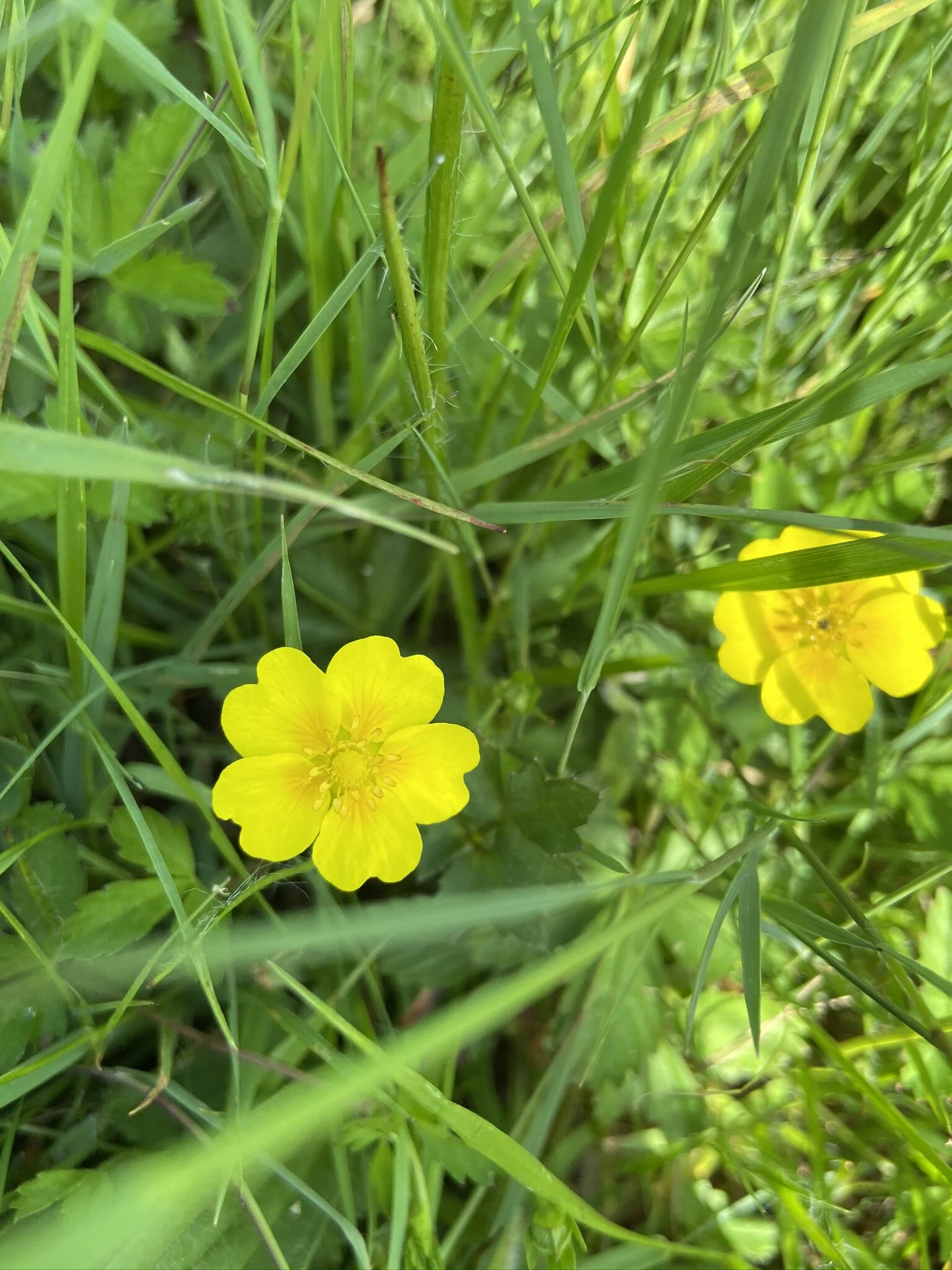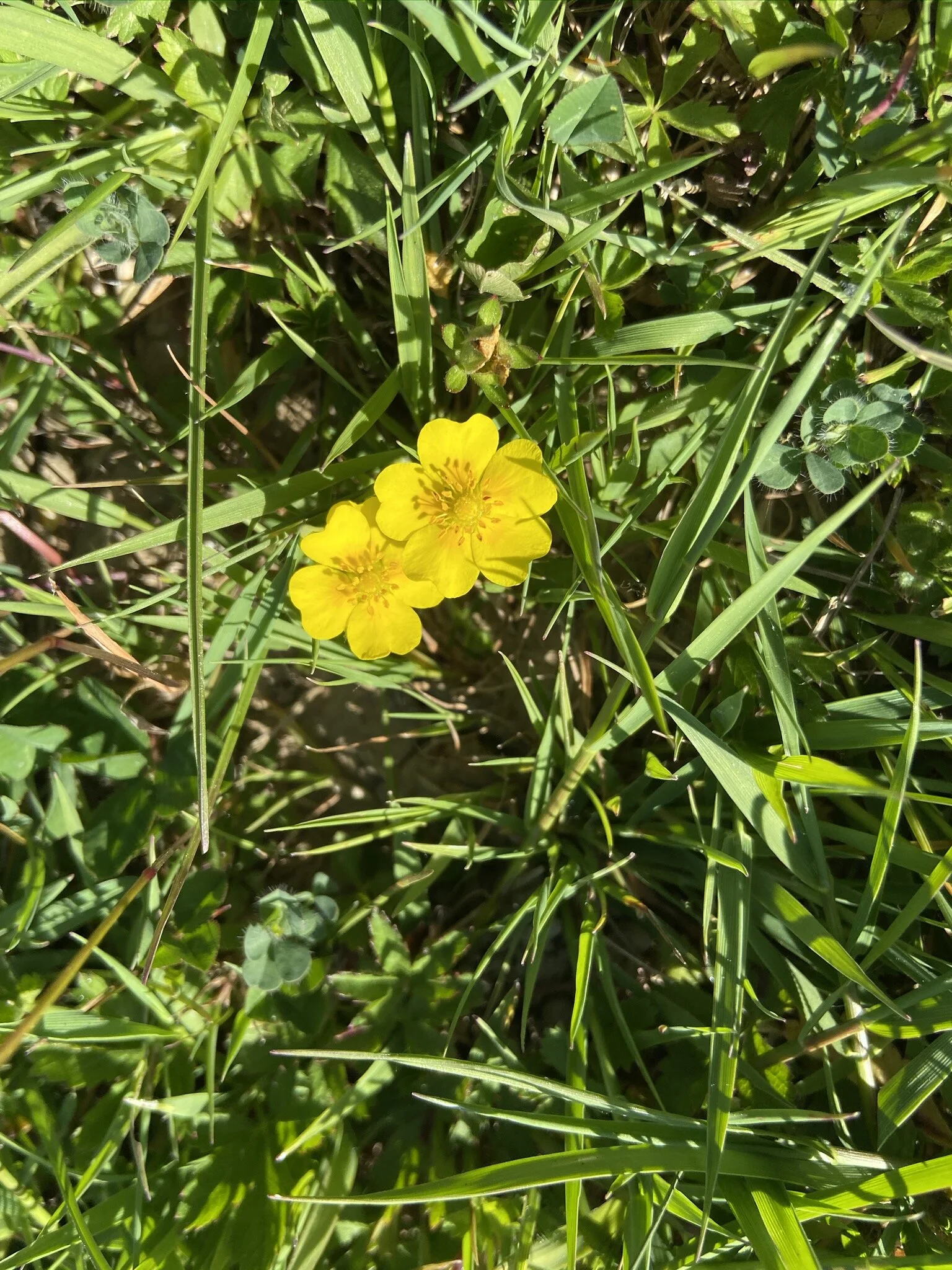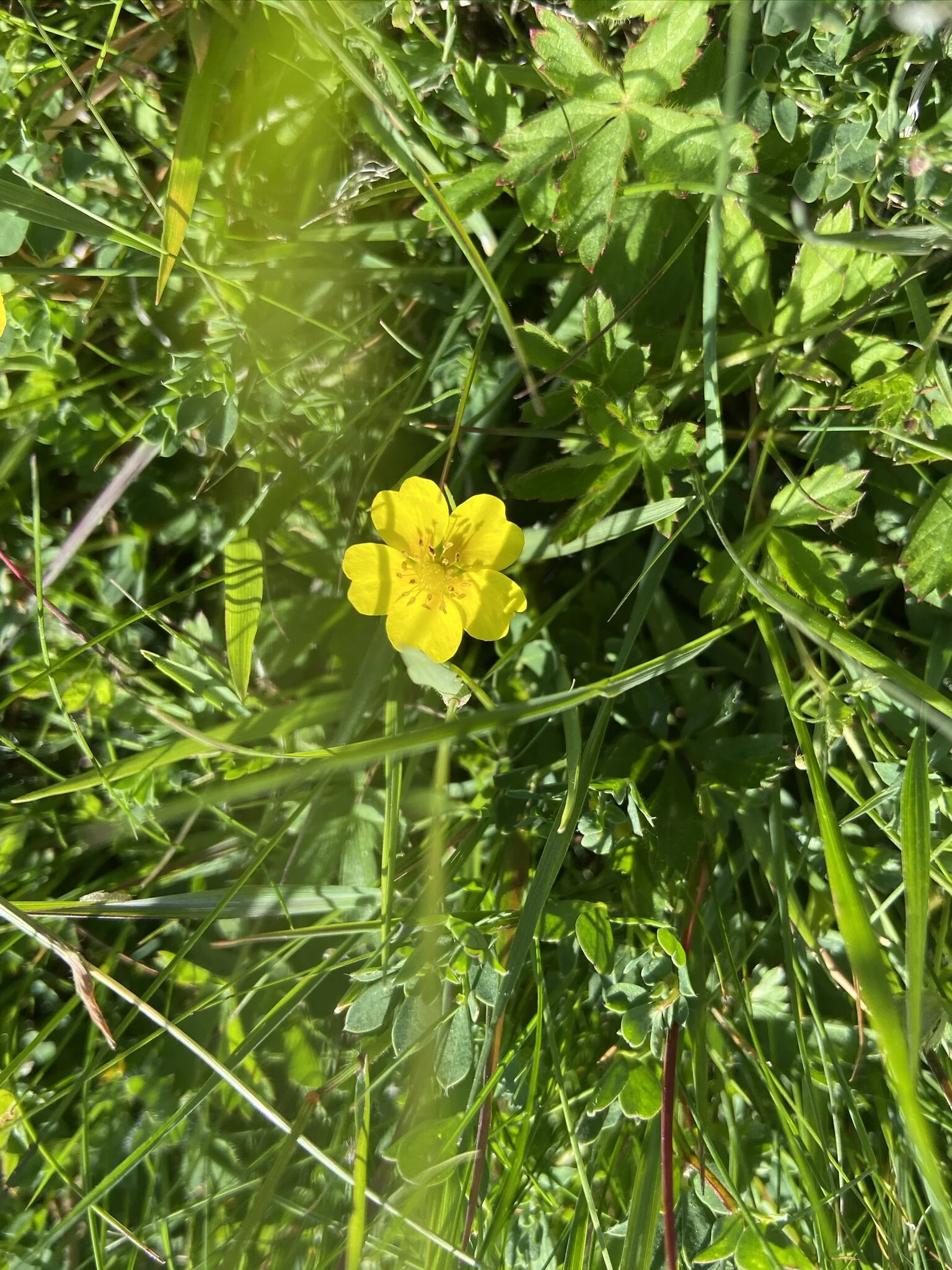 Potentilla reptans, from the Latin potens meaning ‘powerful’. This isn’t a buttercup! This 4 - 5 petalled flower sits close to the ground, sprouting up intermittently, in a rather chaotic fashion.