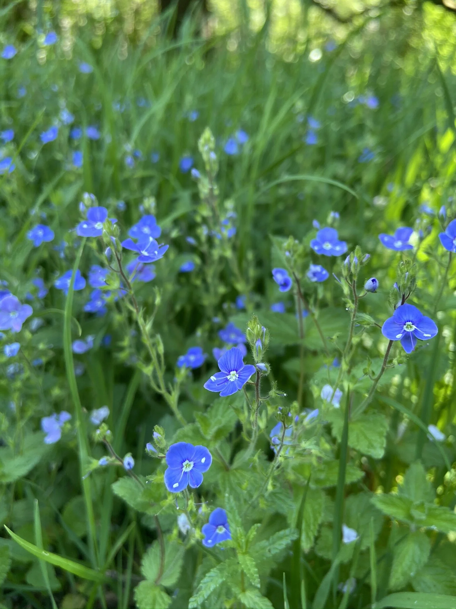 I love that the Genus of this flower and it’s Latin name is Veronica, to me such a serious name for a flower that grows so freely and abundantly, and so it seems with little care. A little very useful book I found, (called Plant Names Simplified) indicates that the word chamaedrys is the ‘old name for Germander Speedwell, signifying ‘on the ground,’ and ‘an oak’ the plant’s habit and shape of leaves’. So very fitting that I discovered my patch under an oak! Once I started looking however, they really were all over the garden, sitting prettily in the grasses..