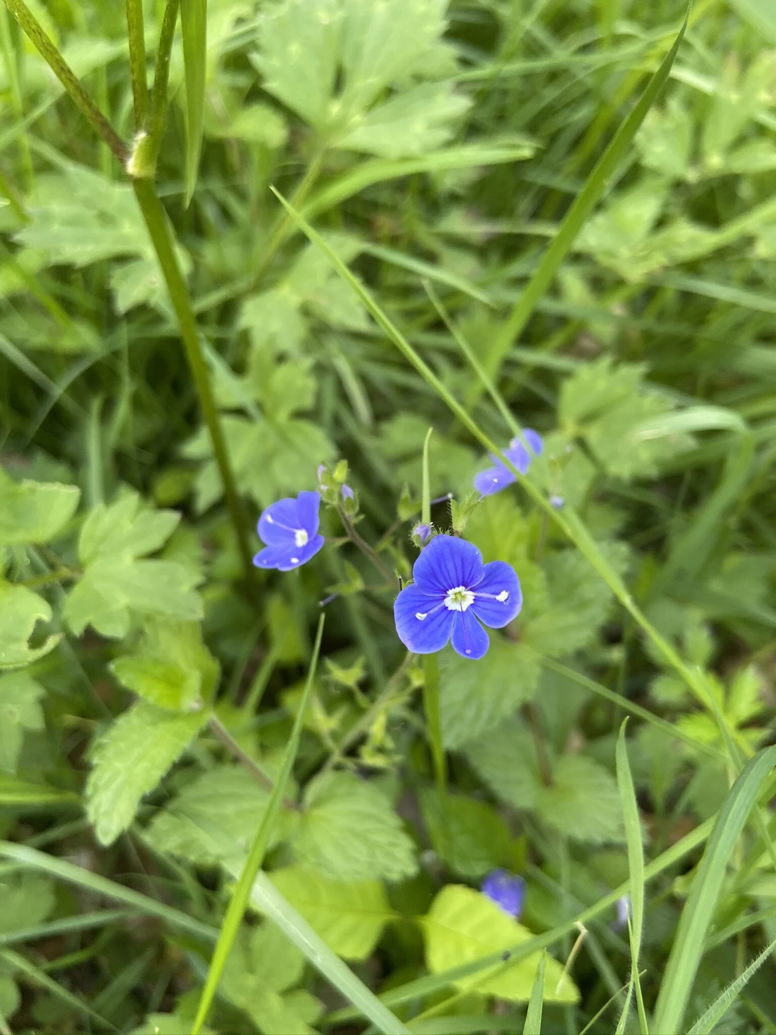 To identify them Collins says ‘Grows in grassy places, meadows and open woodlands, and on verges… FLOWERS 10-12mm across, the corolla 4-lobed and blue with a white centre….LEAVES Oval, toothed, hairy, short-stalked’.