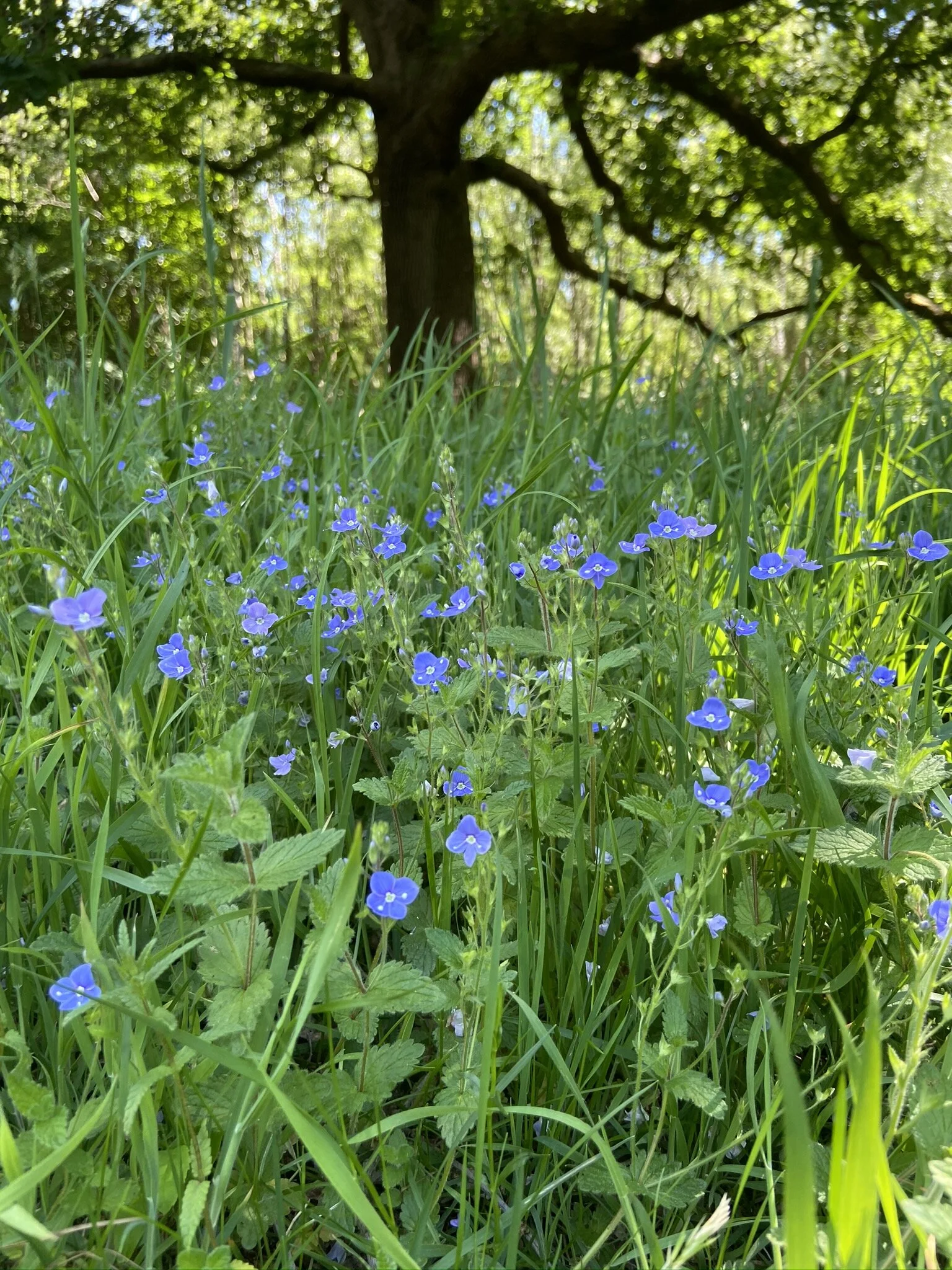 In the shade of an old oak tree, in one of the furthest corners of the garden I came across a beautiful mass of tiny deep blue flowers nestled in the grass.